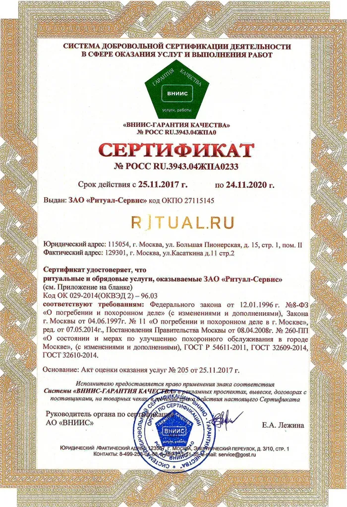 Городская ритуальная служба (ГСС) Ritual.ru ведет свою деятельность в полном соответствии с ГОСТ на ритуальные услуги (сертификат соответствия № РОССRU.Y048.M02789). ЗАО «Ритуал-сервис» (бренд Ritual.ru) — старейшая городская ритуальная служба, оказывающая полный комплекс услуг по организации захоронений и поминок, включая безвозмездные (бесплатные или «социальные») похороны по гарантированному списку услуг и товаров.