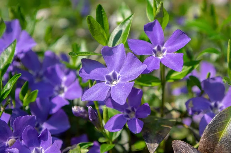 Очень живучий почвопокровный цветок, барвинок нередко используется для украшения могил. Отлично чувствует себя как в тени, так и на солнце, не требует много влаги, не боится сорняков и морозов. Разные сорта барвинка отличаются большим разнообразием оттенков от голубого до пурпурного и декоративной листвой.