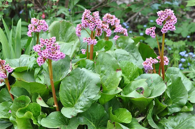 Бадан – очень выносливый многолетник с большими мясистыми листьями и маленькими цветками розового, малинового или кремового цвета. Толстое корневище позволяет бадану прекрасно переносить засуху, он легко зимует под снегом и не требователен к почве. Способен расти в полутени. Бадан вырастает довольно крупным, так что при его посадке нужно следить, чтобы он не загораживал памятник и не мешал проходу.