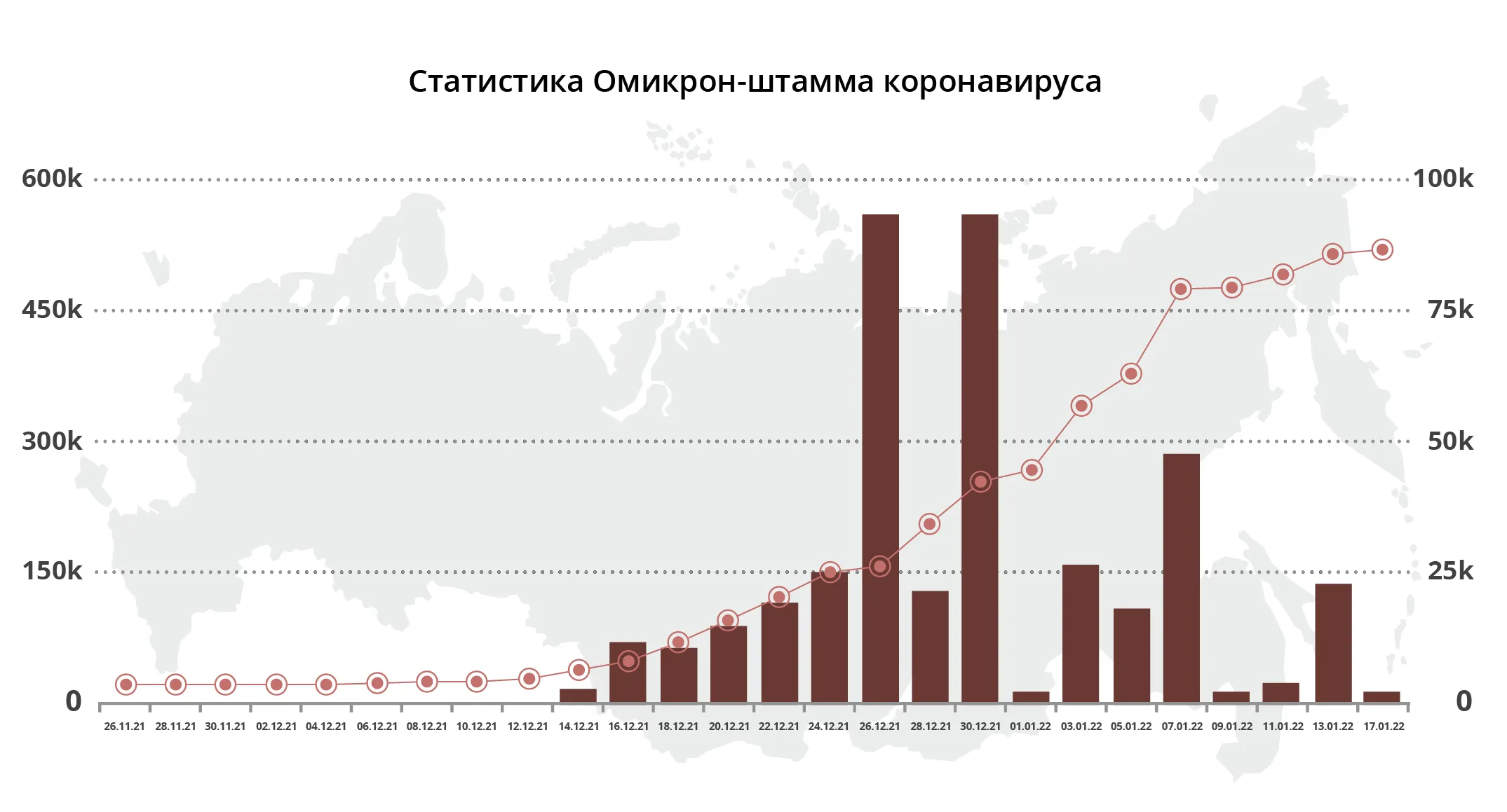 На графике ниже отображена мировая динамика заболеваемости омикрон-штаммом коронавируса на 17 января 2022 года: