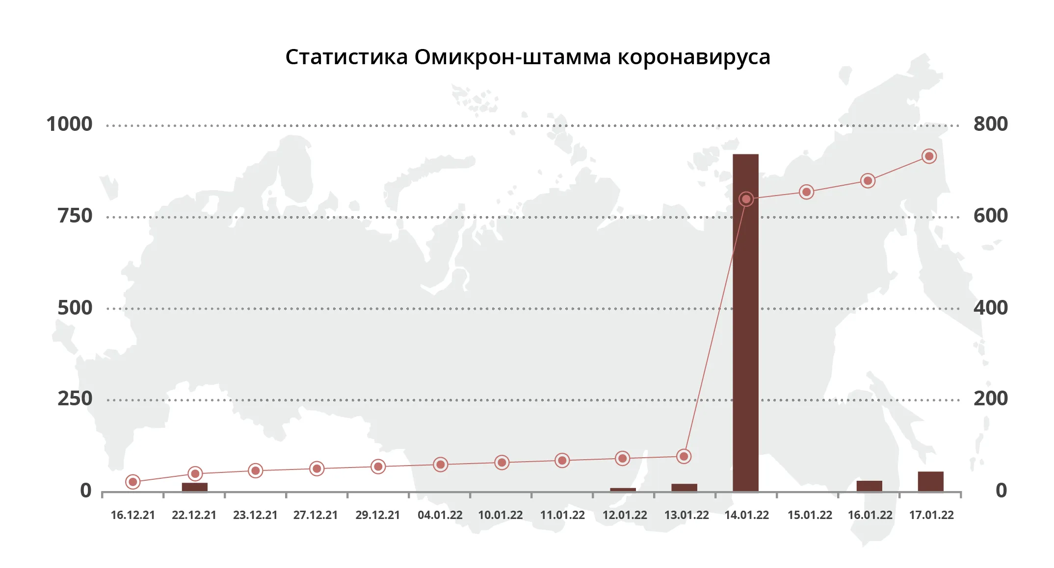 Первый случай заражения на территории нашей страны был выявлен 6 декабря 2021 года. С тех пор их общее число составило 863 (к 17 января 2022 года). До настоящего момента зарегистрированных случаев смерти от омикрон-штамма на территории России не было выявлено.