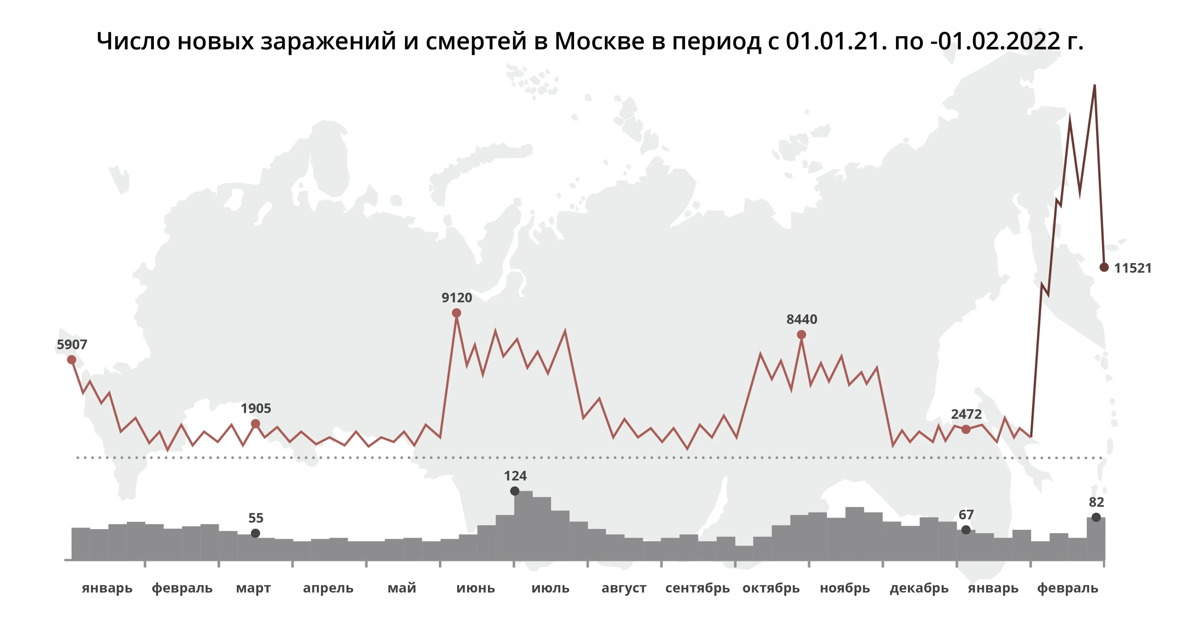 В 2021 году Москва лидировала по заболеваемости COVID-19 по сравнению со всеми другими регионами. 1 января за сутки было выявлено 5907 новых случаев заражения, 31 декабря – 2739. В июне и июле количество заболевающих в день достигало критических отметок в диапазоне 8-9 тысяч.