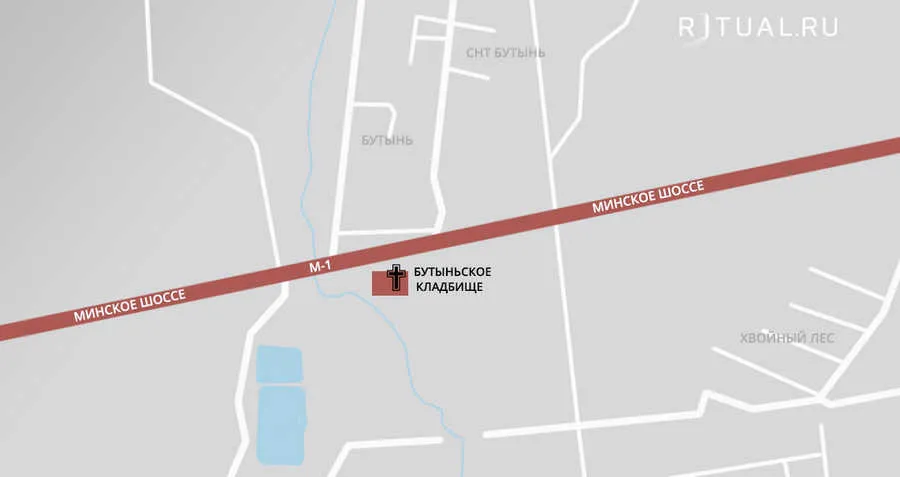 Частный транспорт до Бутыньского кладбища с кольцевой дороги (88-й км, внутренняя сторона) едет по Минскому ш. Через 32 км — съезд к деревне Бутынь и погосту.