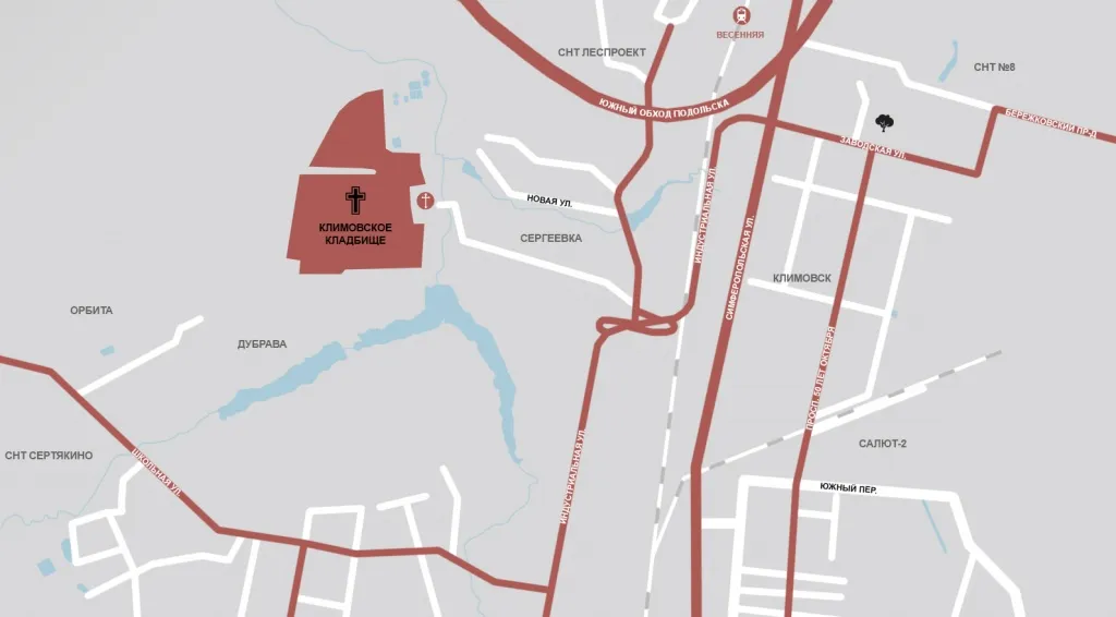 Частный транспорт до кладбища Климовское 1 с МКАД съезжает на Симферопольское ш. По нему на машине нужно следовать до правого съезда на Обводную дорогу. Проехав по ней 4,1 км, выехать на Симферопольское ш., через 3,6 км вновь на Обводную дорогу, а с неё съехать направо, на Южный обход Подольска. Через круговую развязку направиться на ул. Индустриальную, затем свернуть направо и проехать вдоль крайней улицы пос. Сергеевка к кладбищу.