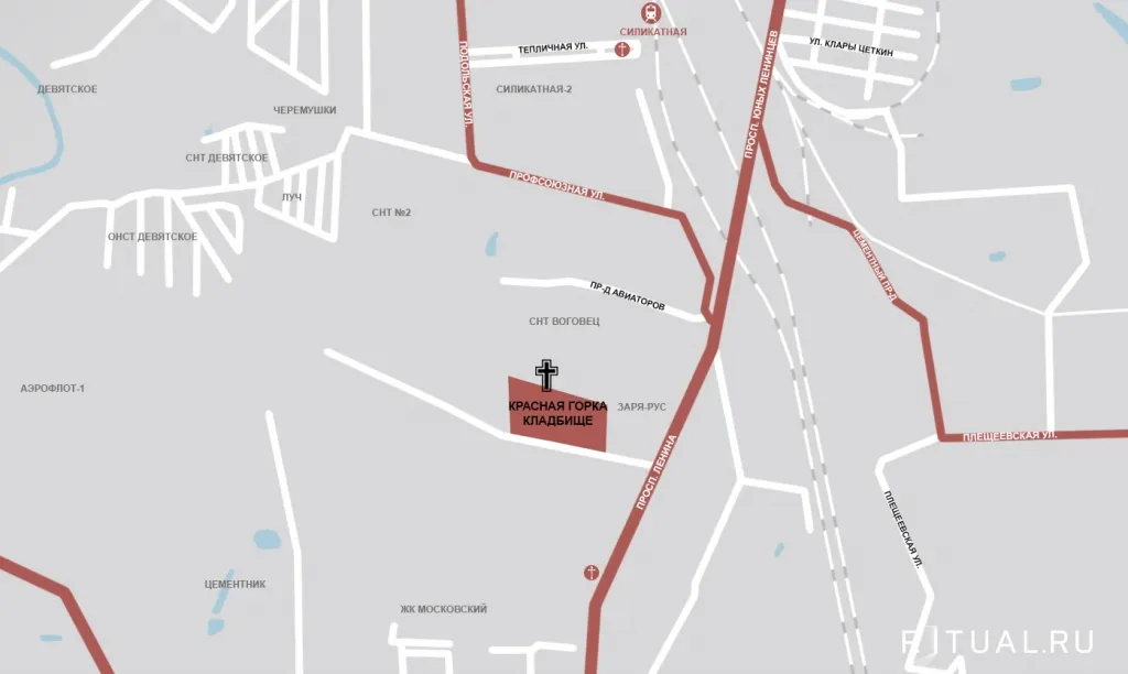 Частный транспорт до кладбища Красная горка 2 с МКАД съезжает на Варшавское ш. По нему на машине нужно проехать 13 км к проспекту Ленина и повернуть направо, к кладбищу.