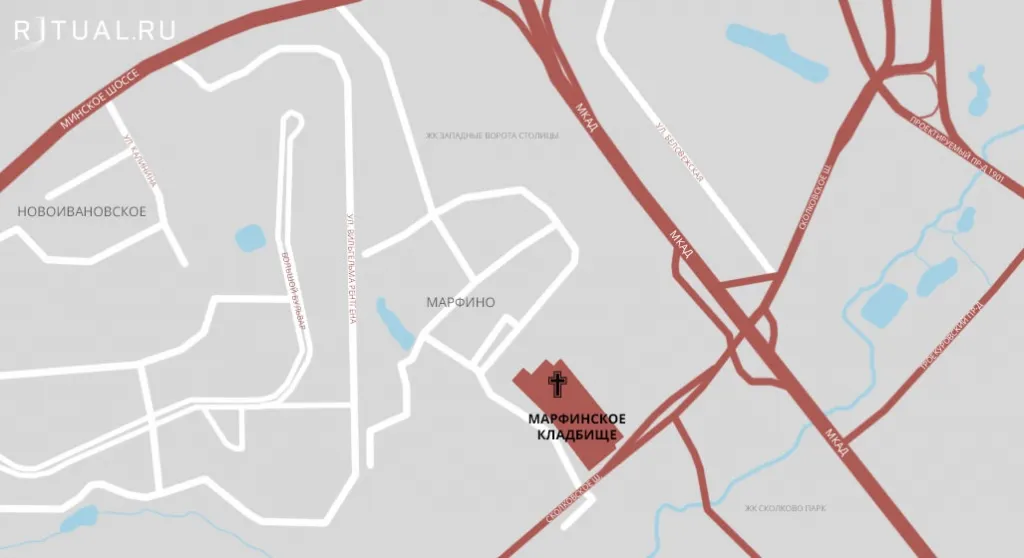 Частный транспорт до Марфинского кладбища с Московской кольцевой едет на Сколковское ш. и через 700 метров съезжает вправо, к некрополю.