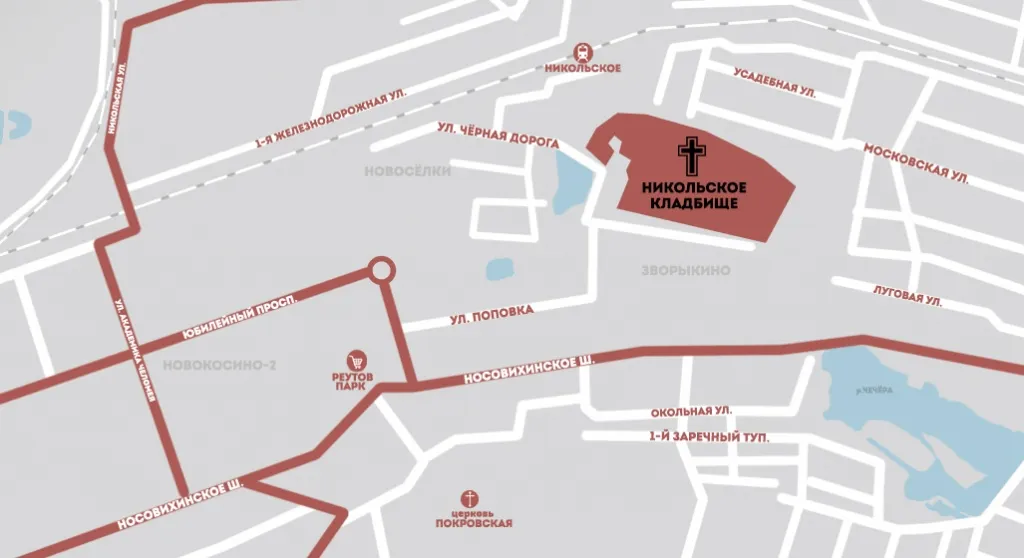 Адрес Никольского кладбища: Московская область, г. Балашиха, ул. Черная Дорога.