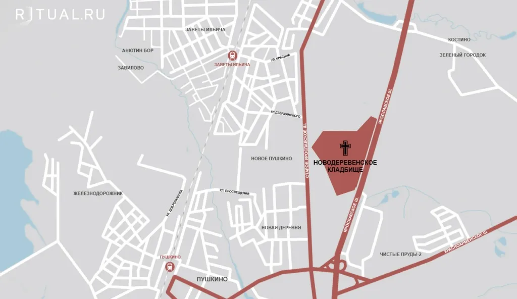 На метро надо ехать до станции «Комсомольская», затем от Ярославского вокзала на электричке доехать до Пушкино, на 14-м автобусе или маршрутном такси №№ 6, 60 проехать до остановки «Новая Деревня» и пройти 1 км до входа на кладбище: сначала обратно по ул. Центральной, затем, повернув налево, по просёлочной дороге.