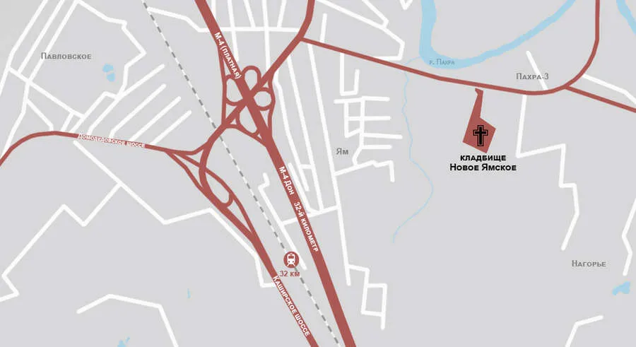 Частный транспорт до Ново-Ямского кладбища с Московской кольцевой едет на Каширское ш., через 13 км, у с. Ям, съезжает влево, к некрополю.