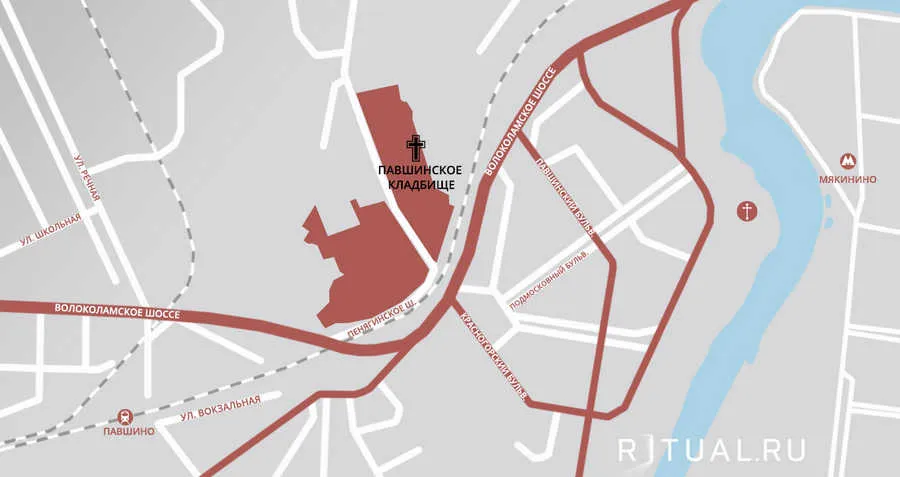 Частный транспорт до Павшинского кладбища с Московской кольцевой едет на Волоколамское ш., через 3 км съезжает вправо, на Пенягинское ш. Павшинское кладбище расположено слева от трассы.