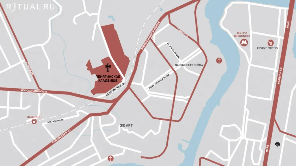 С Московской кольцевой частный транспорт до Пенягинского кладбища едет по Волоколамскому ш., через 3 км — вправо, на Пенягинское ш., к территории некрополя.