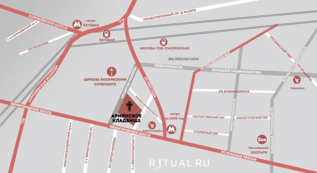 - Расположено напротив территории Ваганьковского кладбища, от которого отделено ул. Сергея Макеева. Ближайшая станция метро – Улица 1905 года.