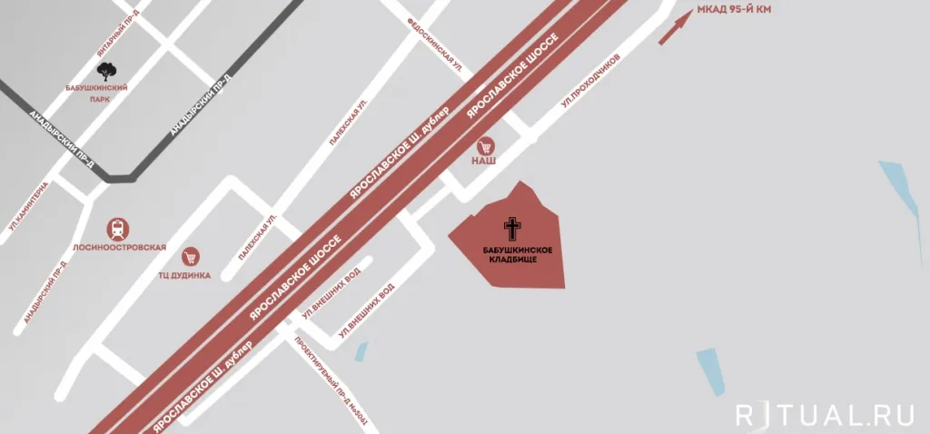 Городской похоронный дом Ritual.ru поможет оформить родственное подзахоронение или приобрести участок под родовое захоронение на Бабушкинском кладбище. Обращайтесь на горячую линию городской информационной службы 8-(495)-100-3-100 (круглосуточно).