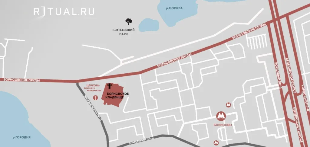 Адрес Борисовского кладбища: Москва, ЮАО, ул. Борисовские пруды, влад. 4.