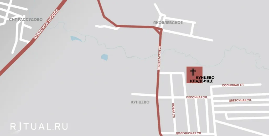 От МКАД: В районе Ленинского проспекта – съезд с МКАД на Киевское шоссе. В районе 38 км. поворот налево на ул. Дорожная, затем направо в сторону дер. Кузнецово. Сразу же после въезда в деревню повернуть налево. Продолжать движение до кладбища (оно будет по правую руку). Время в пути – 30 минут. Километраж – 39,7 км.