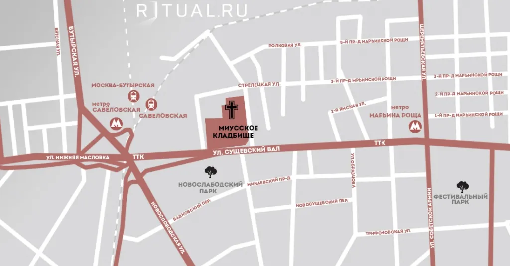 Адрес Миусского кладбища: г. Москва, СВАО, улица Сущевский Вал, 19.