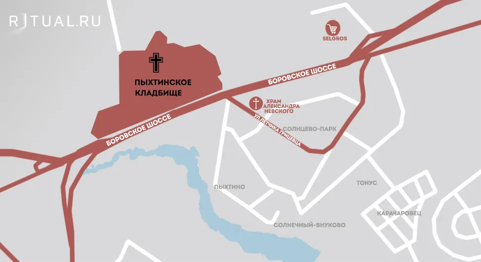 Адрес Пыхтинского кладбища: Москва, НАО, пос. Внуковское, дер. Пыхтино, дом 25, строение 1