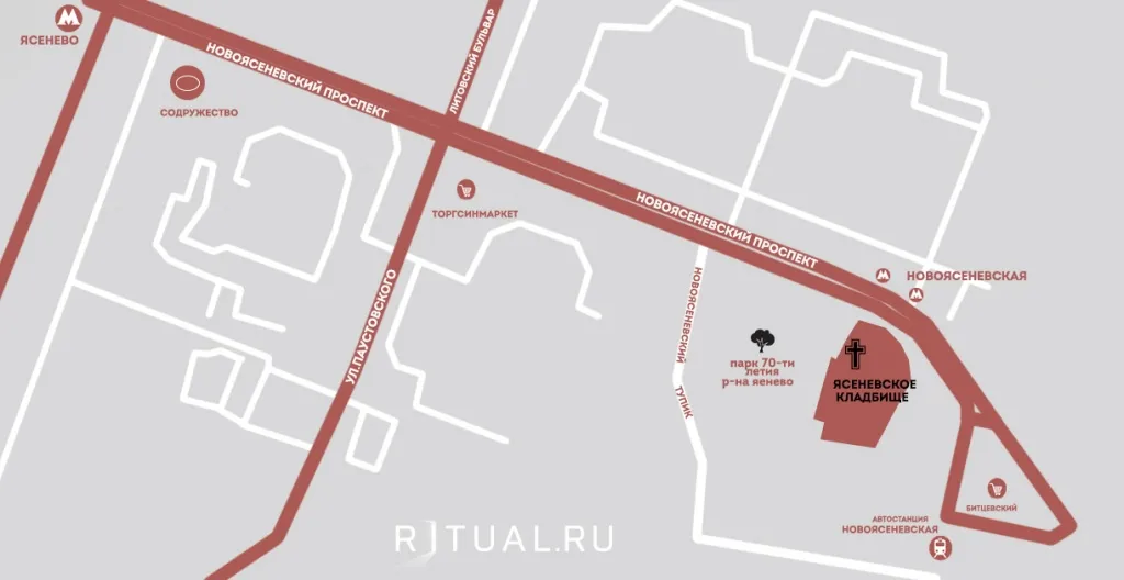 Адрес Ясеневского кладбища: Москва, ЮЗАО, Новоясеневский пр-т, вл. 42.