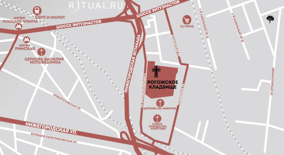 С МКАД — на Осташковскую ул, ул. Енисейскую, через 1,8 км — направо, к стоянке у некрополя.