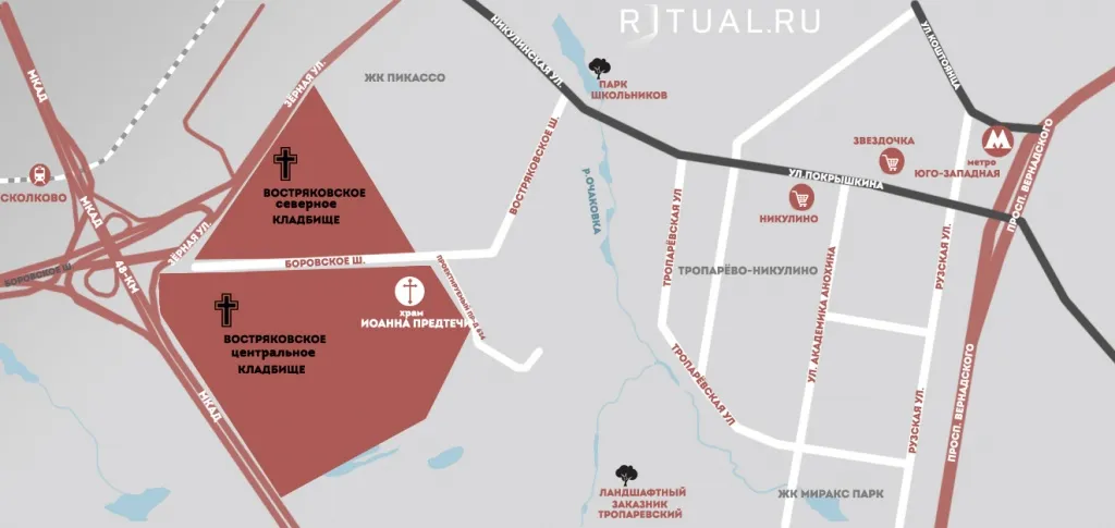 Адрес колумбария Востряковского кладбища: ул. Озёрная, д.47 (Боровское ш., 1).