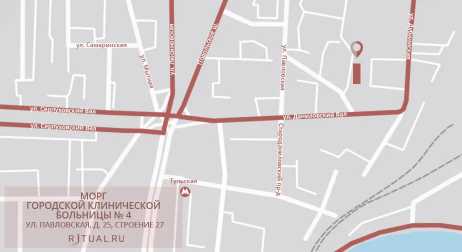 От ст. метро «Тульская» пройти 800 метров: мимо Даниловской часовни на ул. Даниловский Вал, затем влево, на Даниловский переулок и через 40 метров направо, к моргу.
