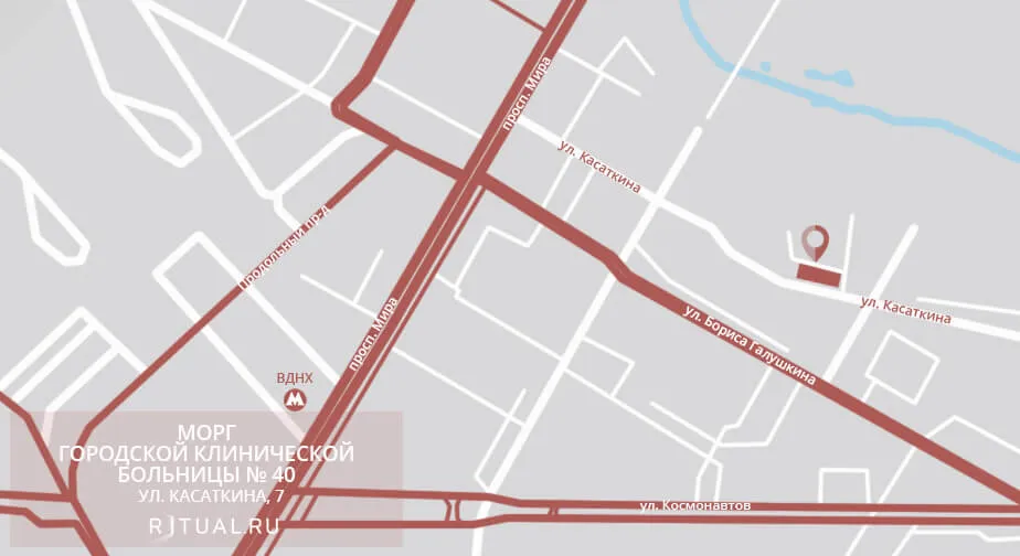 От ст. метро «ВДНХ» автобусами №№ 244, 375, 544 проехать 2 остановки до «Улицы Бориса Галушкина» и пройти 860 метров: через сквер на ул. Касаткина и влево, на территорию больницы, к моргу, расположенному за хирургическим корпусом.