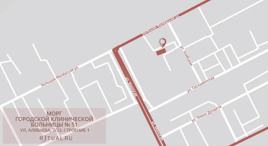 От ст. метро «Филёвский парк» автобусами №№ 104, 130, 155- или троллейбусами №№ 54, 66 проехать. до «Минской улицы» и пройти 450 метров; сначала по Большой Филёвской ул., затем направо, на ул. Алябьева и снова направо, мимо корпуса управления к зданию морга.