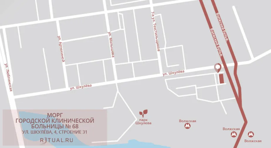 С Третьего транспортного кольца — на Волгоградский просп., затем направо, на Волжский бульвар. Через 1,8 км — снова направо, на территорию больницы, к зданию морга.