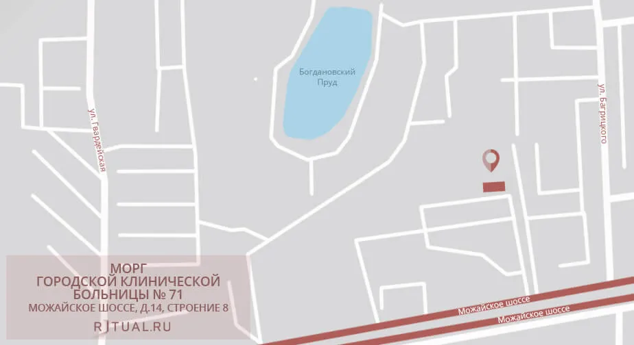 С МКАД — на Рублёвское шоссе, затем вправо, на Можайское шоссе и снова направо, к зданию морга.
