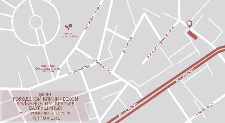 От ст. метро «Сокольники» на трамвае № 7 или № 13 доехать до «Малой Остроумовской улицы» (2 ост.). Пройти к моргу 200 метров по ул. Малой Остроумовской.