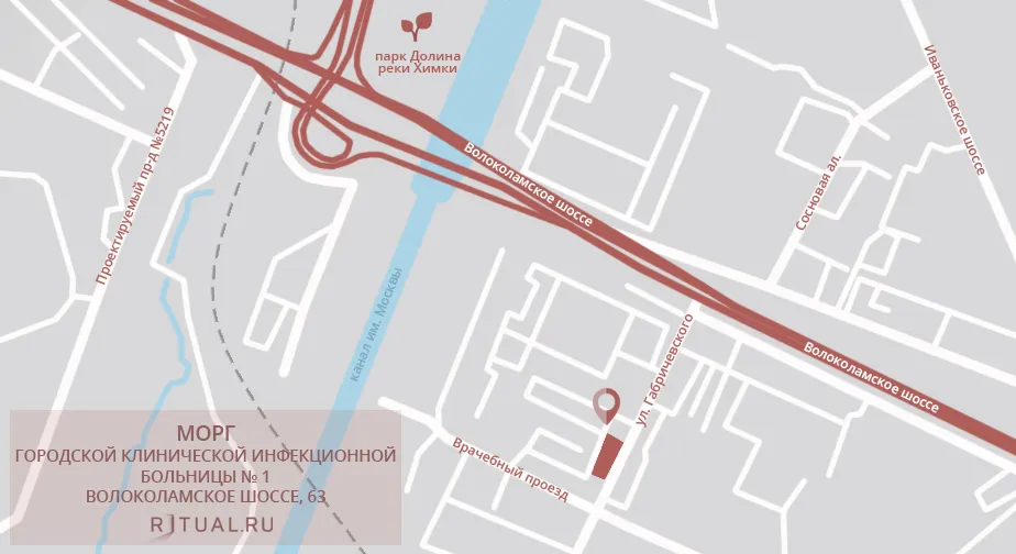 С Третьего транспортного кольца — на Ленинградский пр-т и Волоколамское ш. Через 2,6 км, у Покровской церкви, съезд вправо, затем, через 1,3 км, поворот налево и выезд на ул. Габричевского, к моргу.