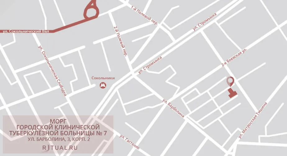 От ст. метро «Сокольники» пройти к зданию морга 930 метров: сначала вдоль ул. Стромынка, затем направо, по ул. Барболина и влево, между корпусами больничного комплекса.