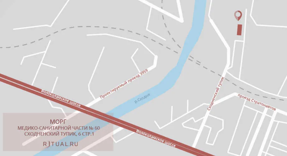С МКАД — на Волоколамское ш., через 2,3 км поворот и выезд влево, на Сходненский тупик, к зданию морга.