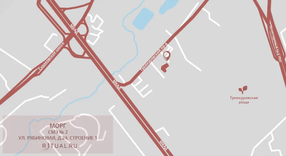 С МКАД (54-й км) — на Можайское ш., затем влево, на ул. Вяземскую, Проектируемый проезд № 1901 и вправо, на Троекуровский проезд. Через 600 м съезд влево, к зданию морга.