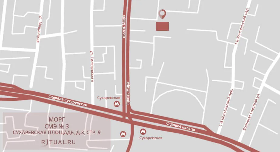 С МКАД — на Ярославское ш. и просп. Мира, через 8.3 км поворот налево, в Грохольский переулок, затем направо, в 1-й Коптельский переулок, выезд вправо, на Садовое кольцо, снова направо, на просп. Мира и поворот в правую сторону, к зданию морга.