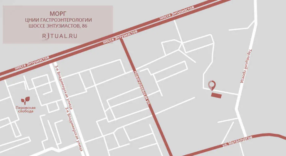 С МКАД — на ш. Энтузиастов, через 1,2 км поворот и выезд влево, на Свободный просп., затем вправо, на ул. Металлургов, и снова вправо, на Терлецкий проезд, к ЦНИИ и зданию морга.