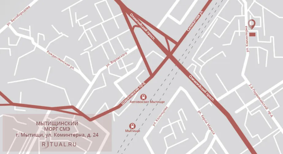 От ст. метро «Комсомольская» электричкой ехать до ст. «Мытищи», затем маршрутным такси № 12 проехать 3 ост. до «Улицы Коминтерна» и пройти 200 метров к корпусу морга.