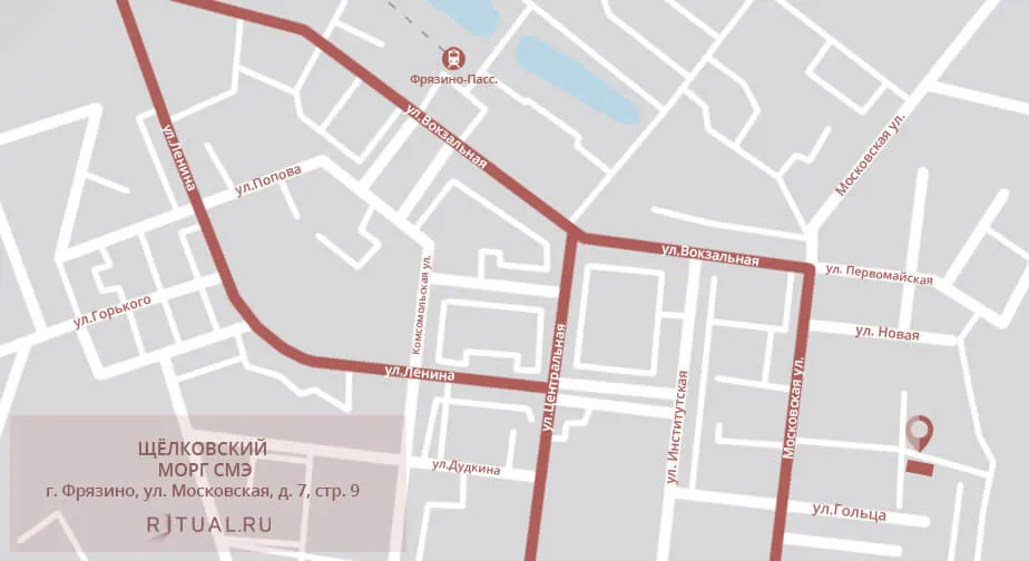 С МКАД на Щёлковское ш., через 13 км влево, на Фряновское ш. Через 10 км влево, на ул. Московскую и вправо, к моргу.