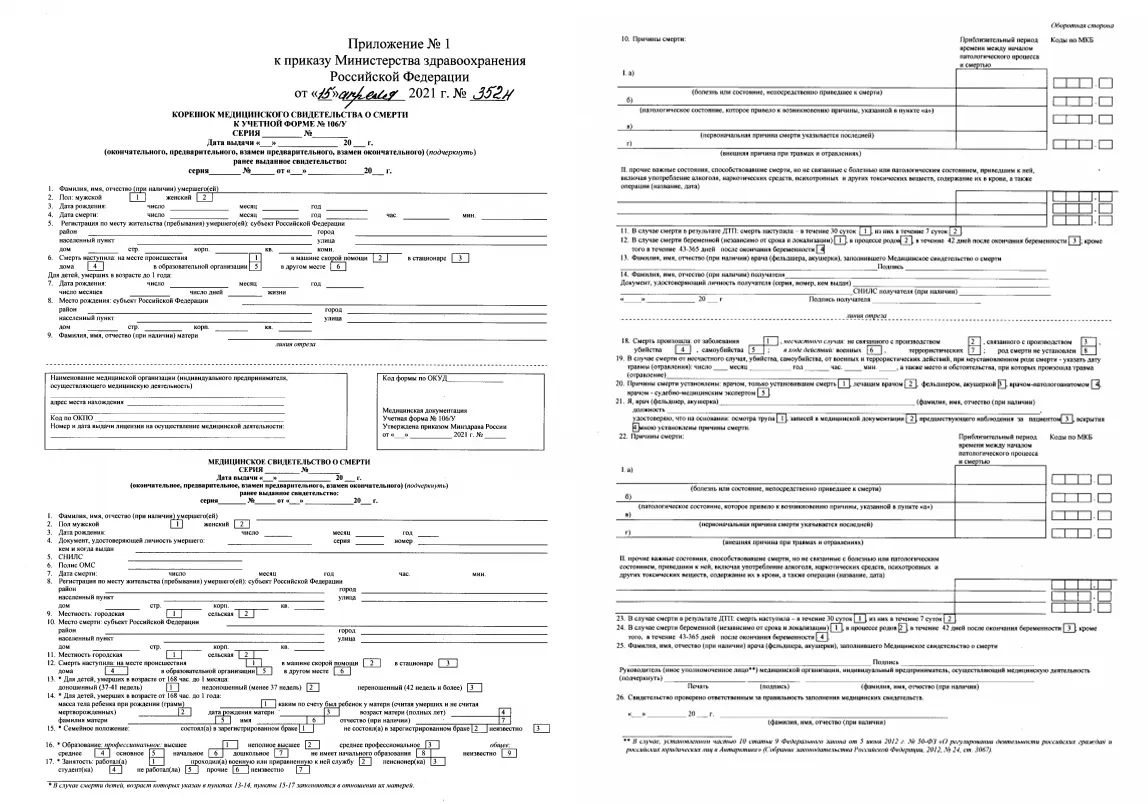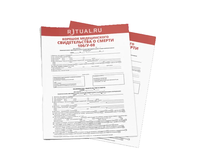 Медицинское свидетельство о смерти по форме № 106/у – это документ, регистрирующий смерть физического лица. На основании него любой МФЦ (центр государственных услуг «Мои документы») или отдел ЗАГС г. Москва выдает вам (вашему доверенному лицу или представителю ритуальной службы) гербовое свидетельство о смерти.