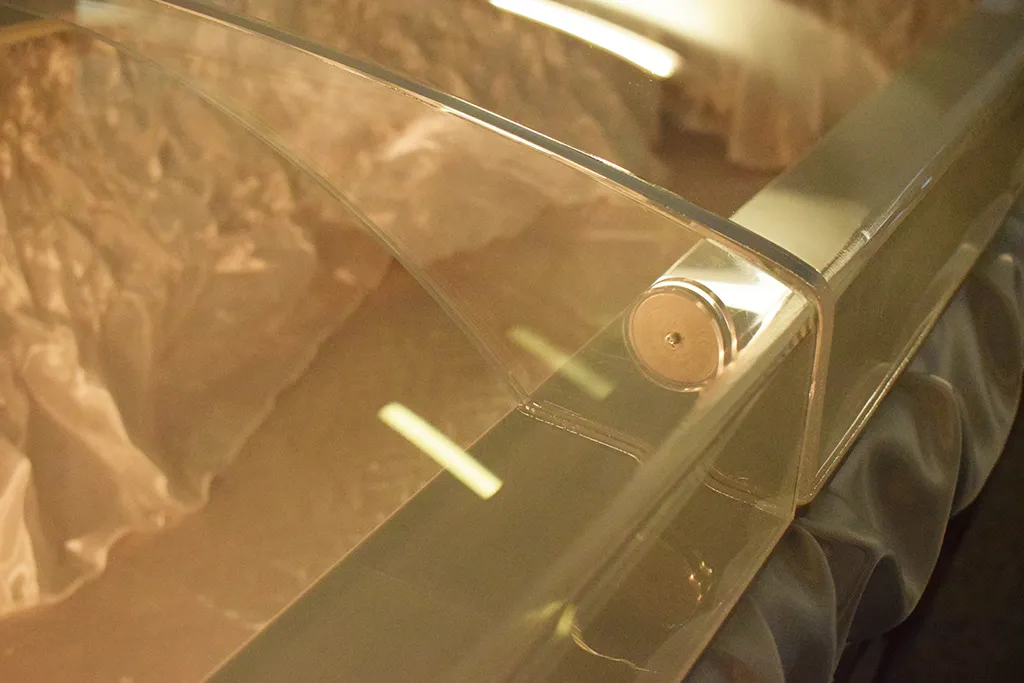 Ритуальная сфера не стоит на месте. Одна из новых разработок - инновационный прозрачный футляр со встроенной системой очищения и обеззараживания воздуха. Метакрилантная крышка накрывает гроб и позволяет скорбящим полностью обозревать усопшего.
