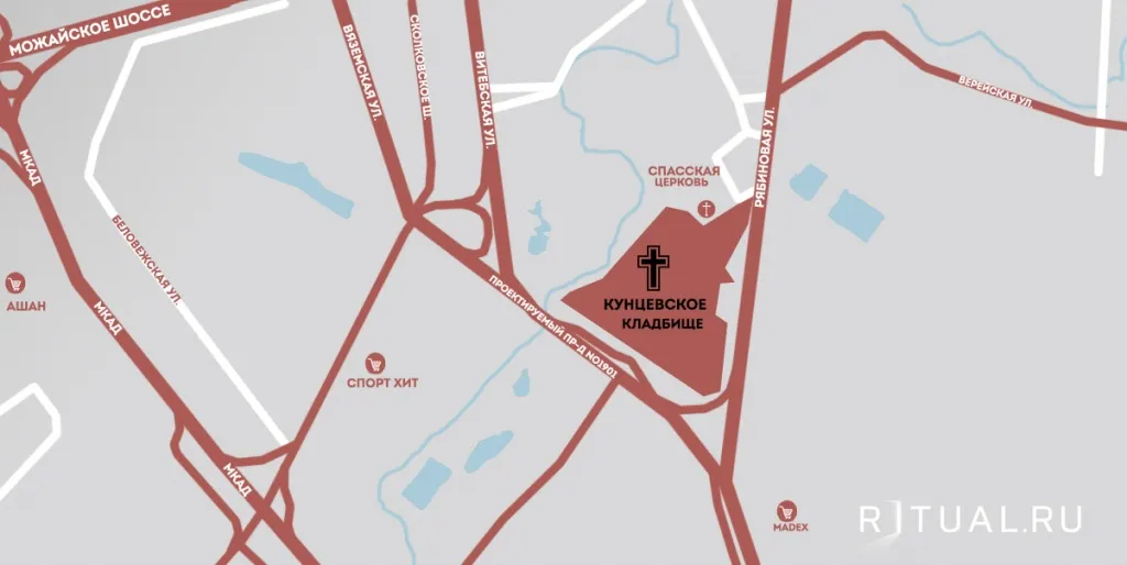 С ТТК на Кутузовский просп. и Можайское ш. Через 1,9 км влево, на ул. Рябиновую, через 1,1 км поворот вправо, к некрополю и храму.