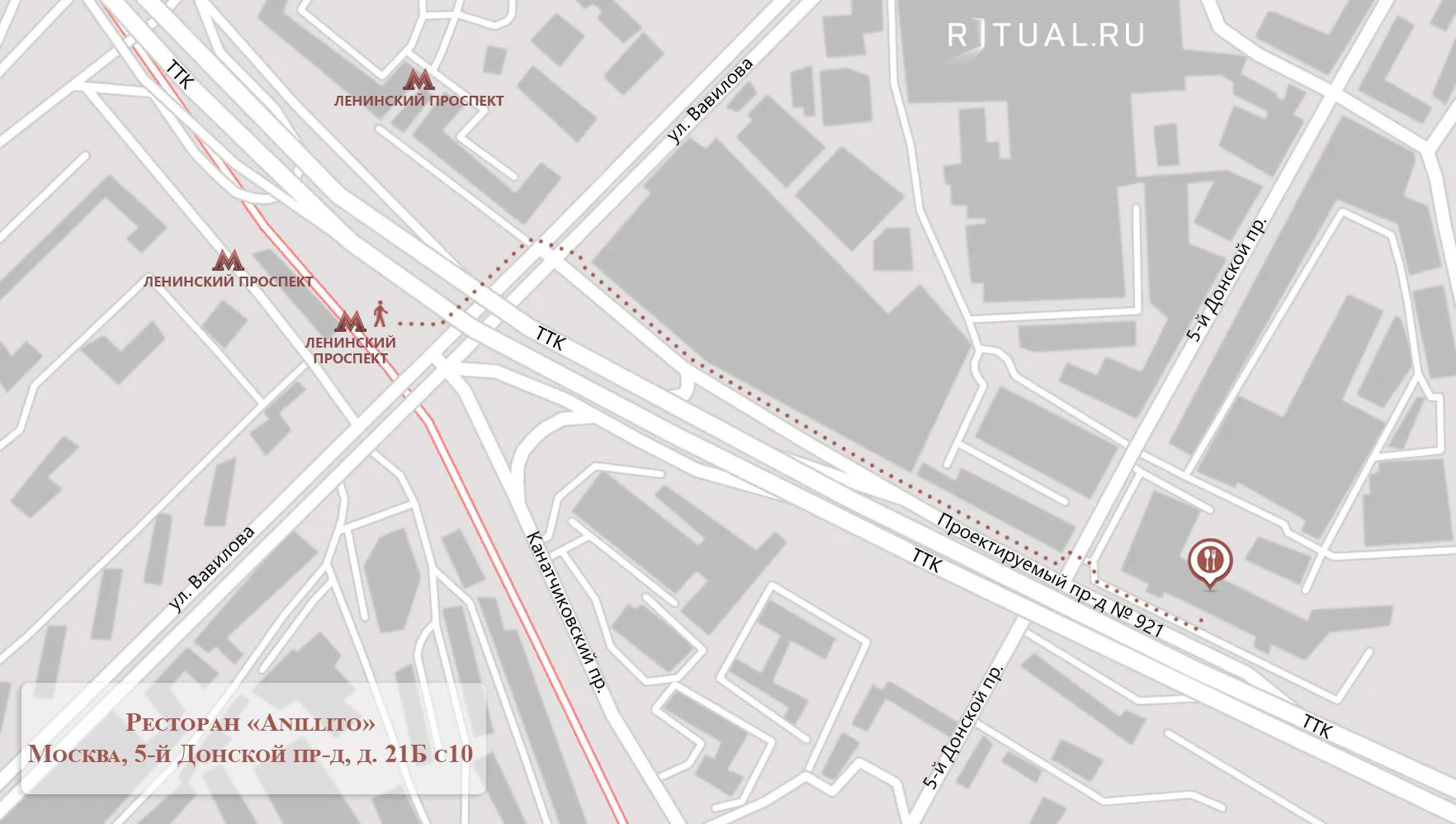 От станции метро «Площадь Гагарина» пройти пешком 800 м до ресторана вдоль ул. Вавилова и Проектируемого проезда № 921.