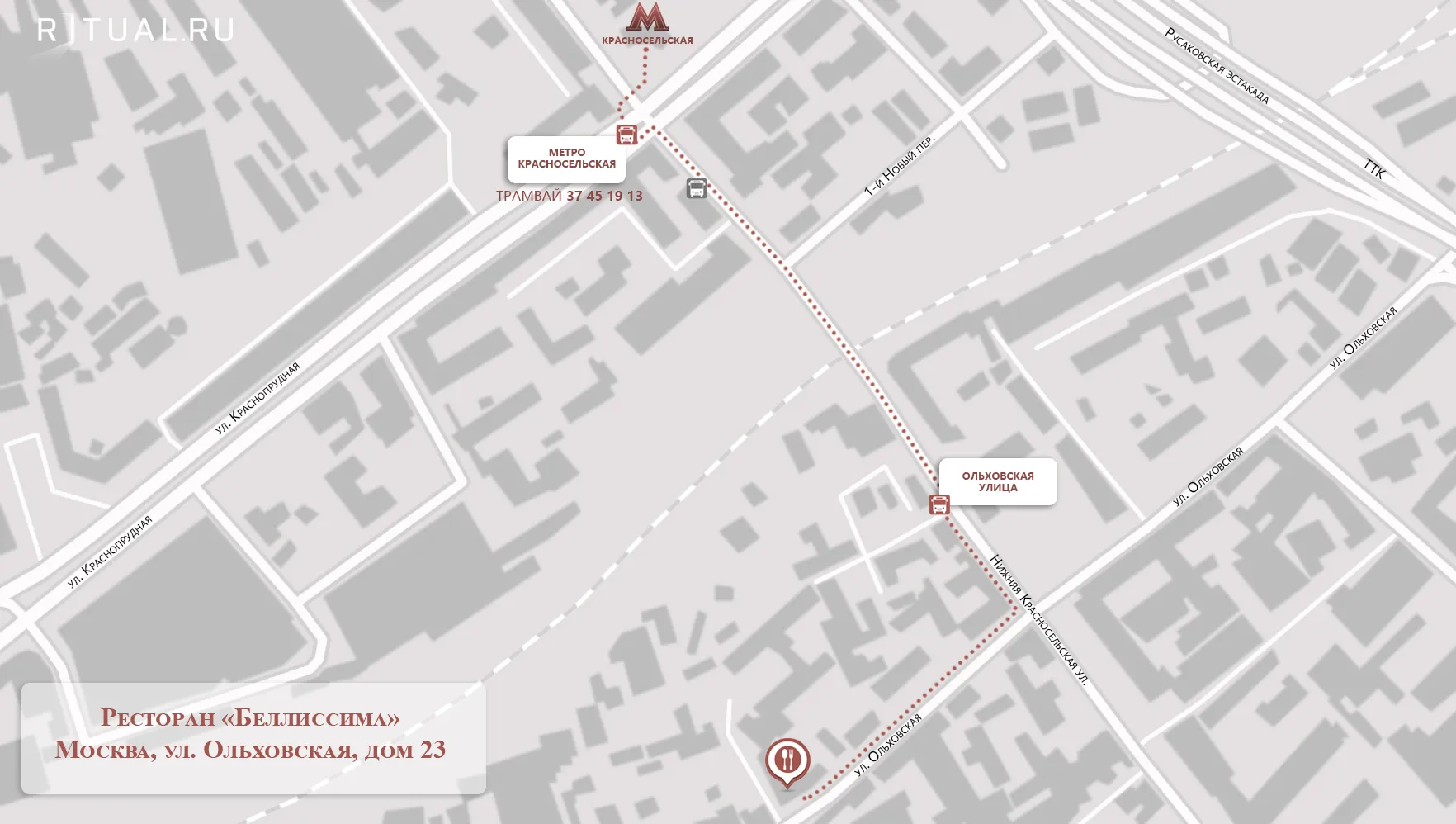 С ТТК (Лефортовский тоннель) съехать правее (параллельно ТТК) в Спартаковский переулок. Далее налево на Ольховскую улицу. По Ольховской ул. проехать 700 м до ресторана (справа).