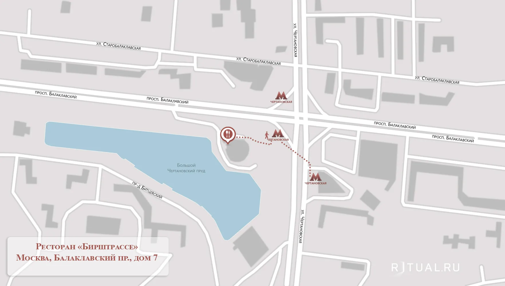 От МКАД (32-й км) съехать на Варшавское шоссе. Прямо 4,6 км. Затем правее на дублер. Далее налево на Сумскую улицу. Через 900 м поворот направо на Чертановскую улицу. С Чертановской улицы налево на Балаклавский проспект до разворота в обратную сторону. По правую руку водоём, за ним заезд к ТЦ «Альянс», на территории которого находится кафе «БирШтрассе».