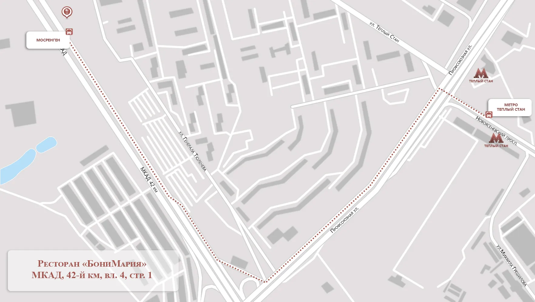 От станции метро «Тёплый Стан» автобусами № 767, 781 проехать до остановки «Мосрентген» (2 ост.) и пройти 50 м к ресторану.