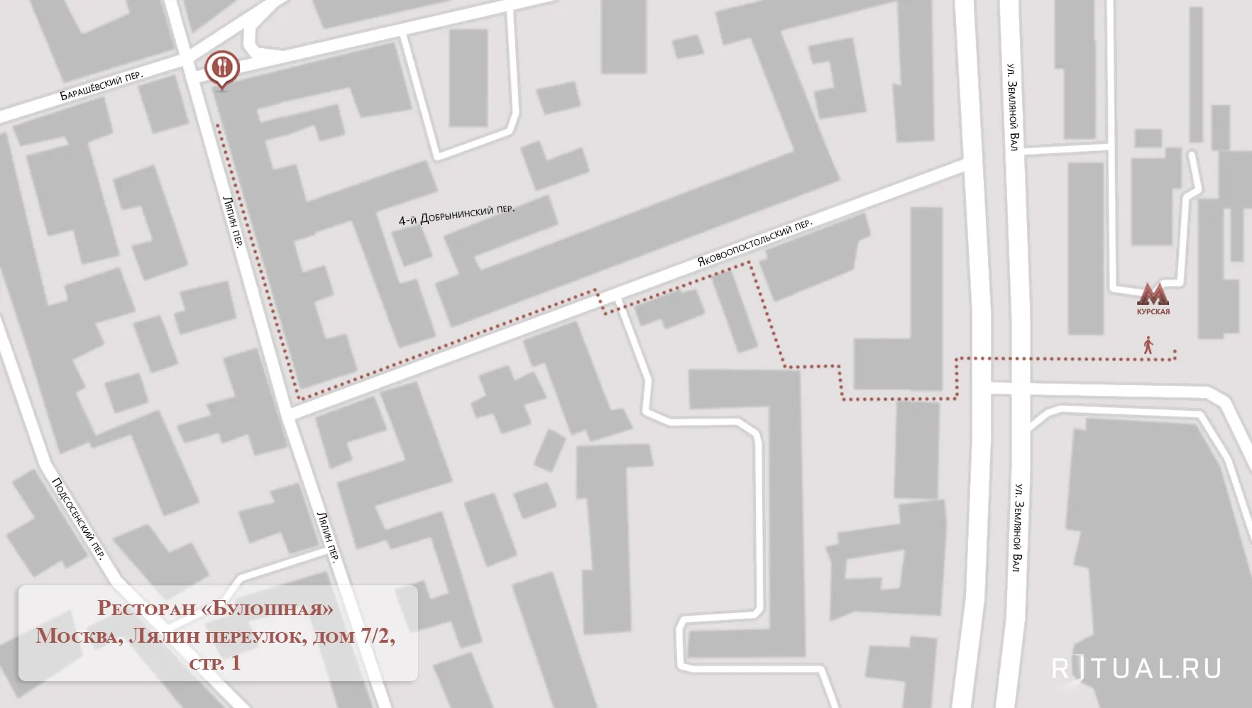 Метро «Курская», пешком 8 минут. На светофоре перейти Земляной Вал (Садовое кольцо), повернуть налево в Яковоапостольский пер. Идти по Яковоапостольскому пер. до пересечения с Лялиным пер. Далее направо в Лялин пер. до ресторана (с правой стороны).