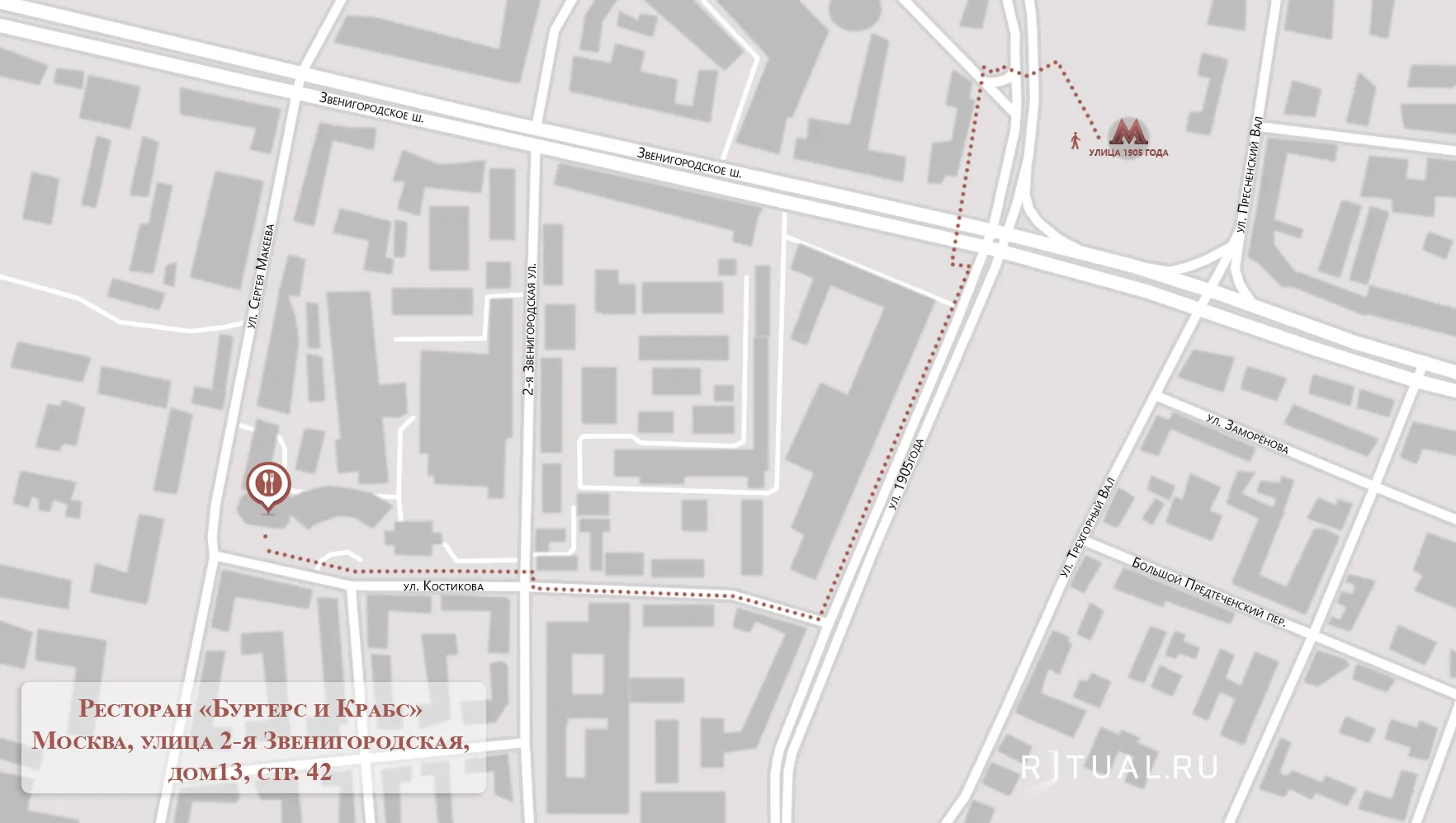 Станция «Улица 1905 года». Пешком 12 минут. От выхода в сторону Звенигородского шоссе. Перейти Звенигородское шоссе и следовать по улице 1905 года. За домом № 7 стр. 1 направо на улицу Костикова. Дойти до конца улицы. С правой стороны, на пересечении улиц Костикова и Сергея Макеева, расположен ресторан.