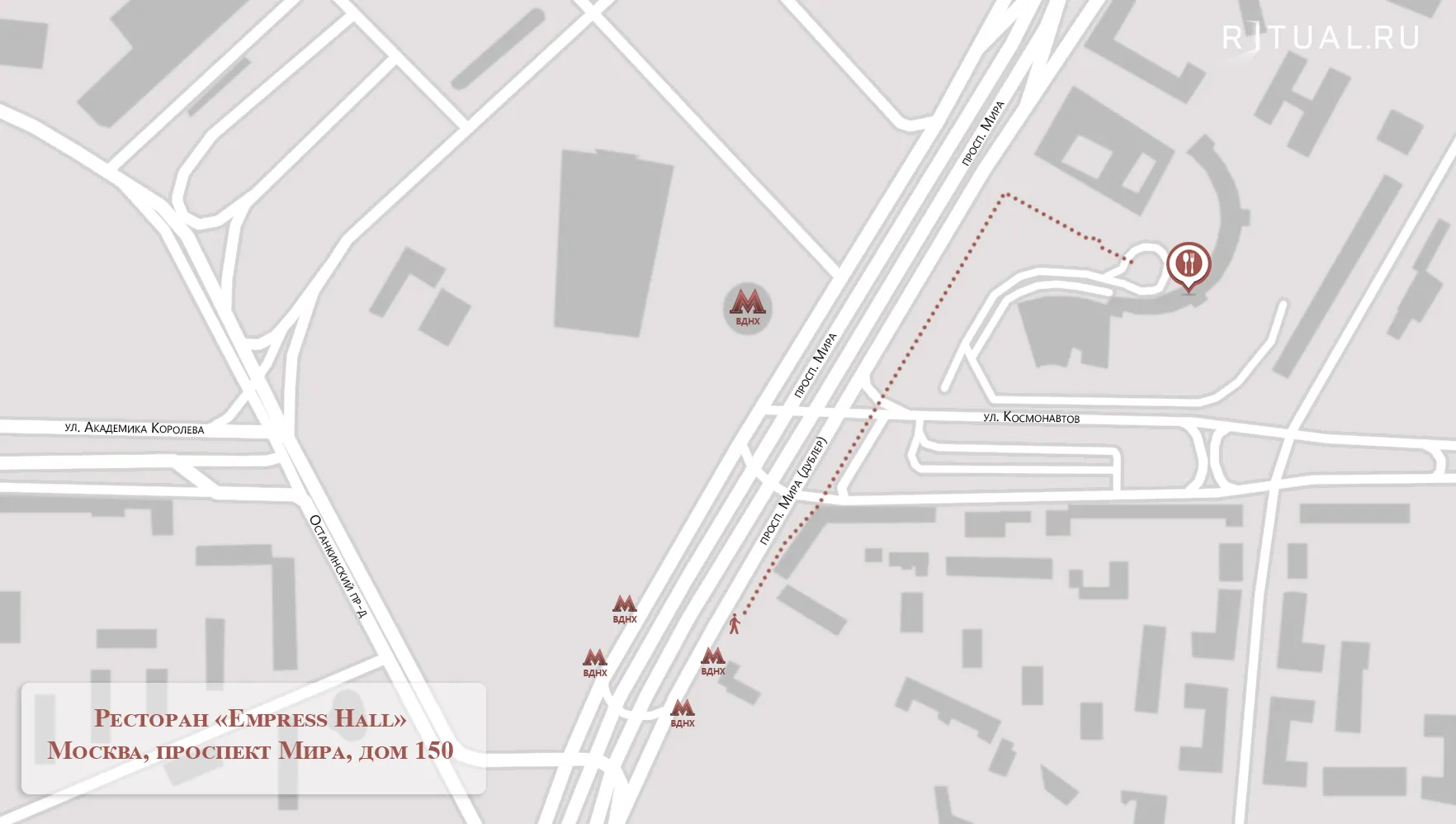 От МКАД (94-й км) съезд на Ярославское шоссе. Через 1,6 км на дублёр Ярославского шоссе. Прямо по проспекту Мира 2,1 км. Далее с дублёра проспекта Мира налево на улицу Галушкина. Через 350 м правее на Ярославскую улицу. Затем повернуть налево к гостинице «Космос», на территории которой находится банкетный комплекс.