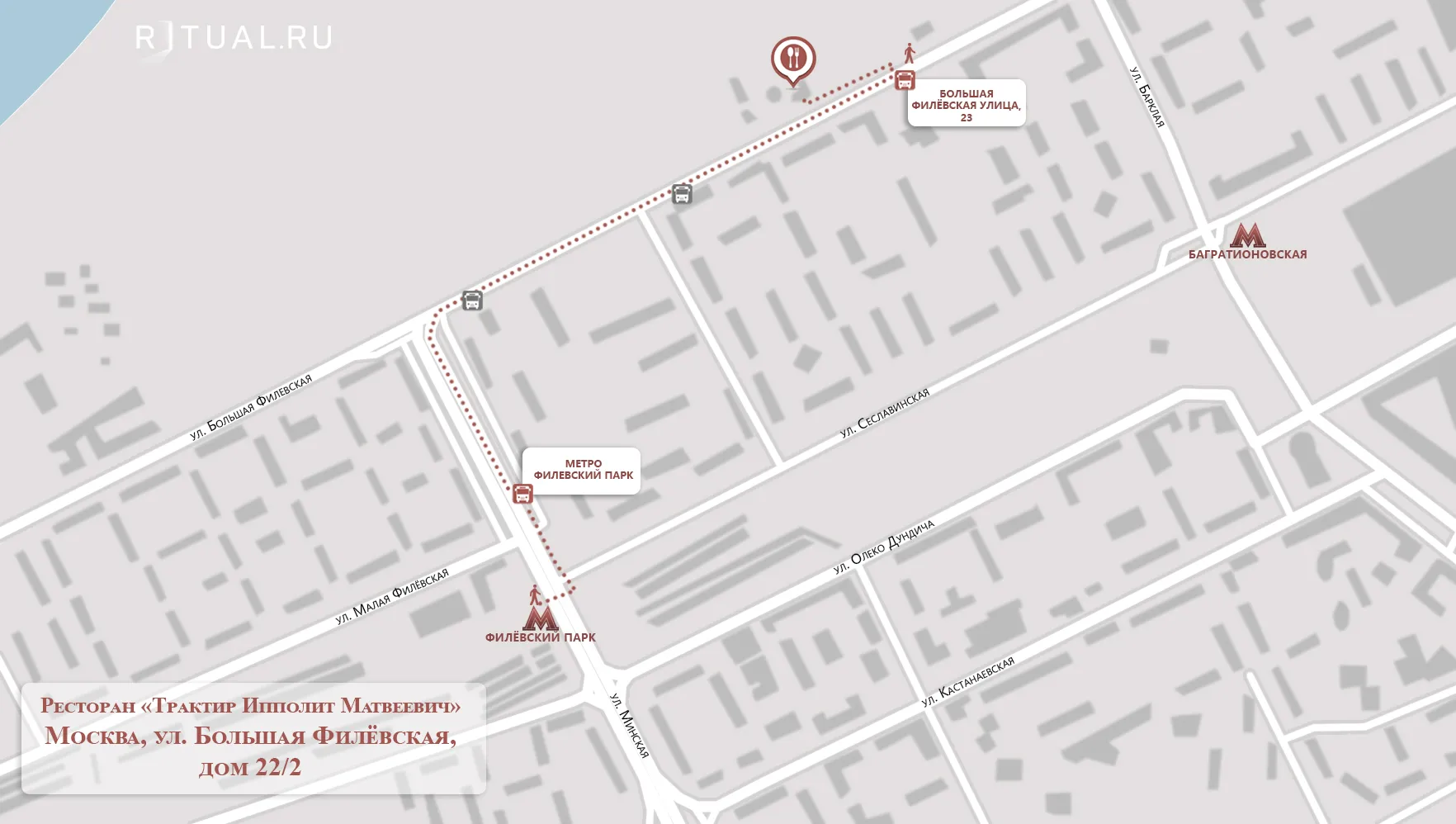 Ост. «Большая Филёвская улица, 23», 3 минуты пешком до трактира.