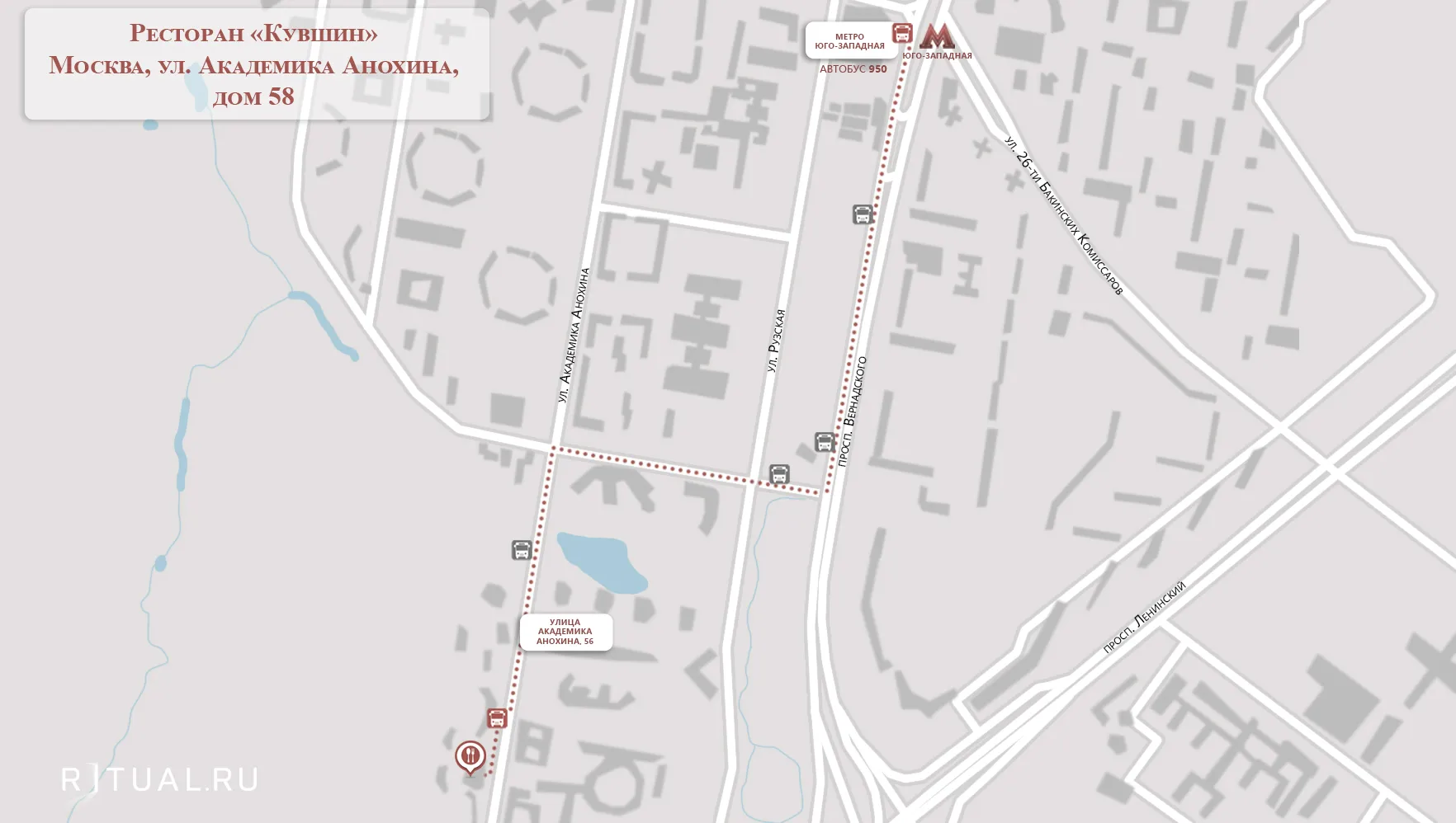 Из Центра по Ленинскому проспекту до поворота направо на проспект Вернадского. Через 400 м перед храмом повернуть на Тропарёвскую улицу. С неё налево на улицу Академика Анохина. Проехать 620 м до здания ресторана (справа).